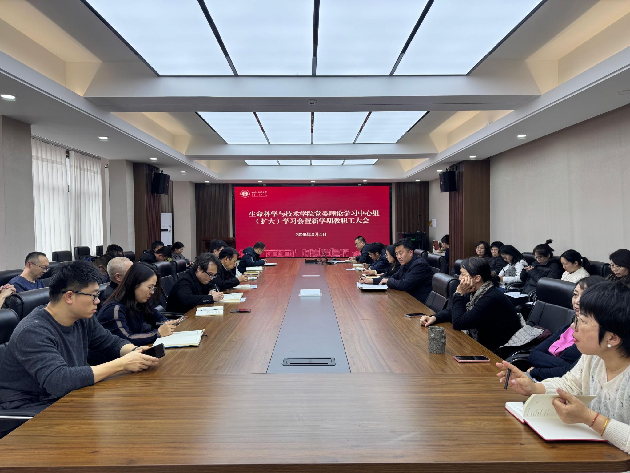 在生物楼三楼会议室召开党委理论学习中心组(扩大)学习会暨新学期教职工大会,全体教职工参加会议。