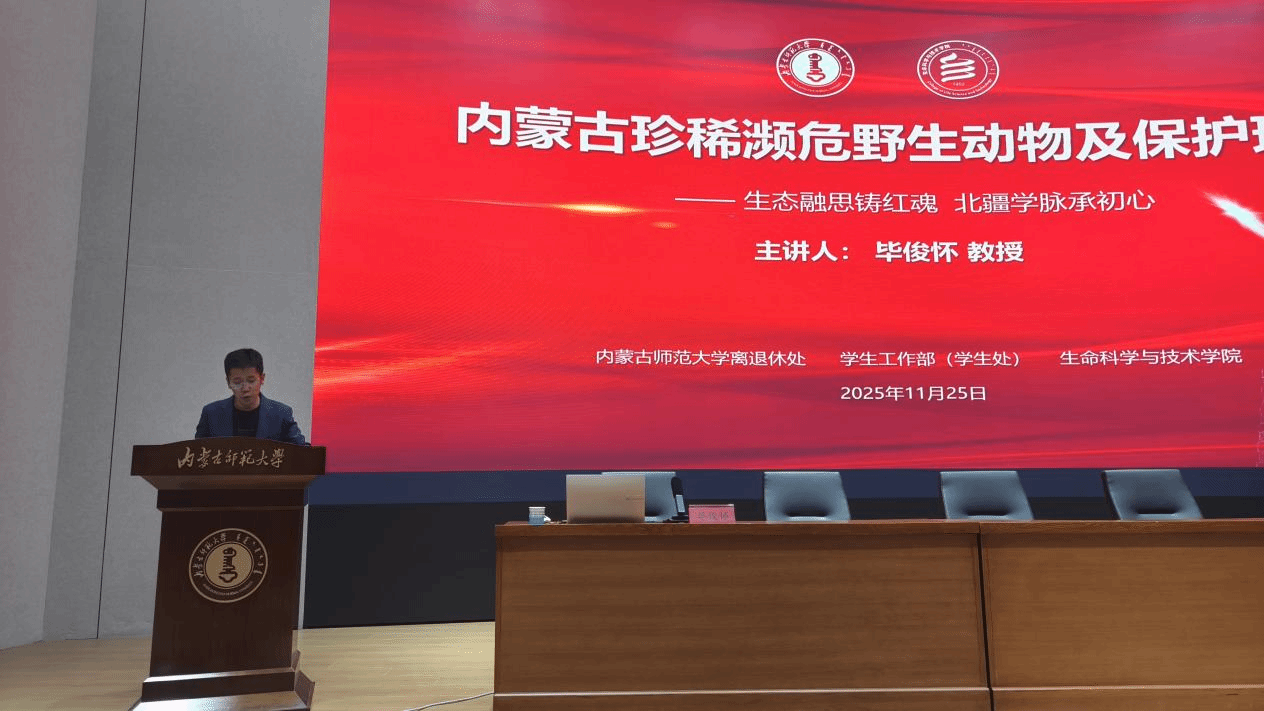 承办的离退休教授宣讲活动在赛罕校区信息楼学术报告厅举行。本次活动以"生态融思铸红魂,北疆学脉承初心"为主题,邀请毕俊怀教授做了题为《内蒙古珍稀濒危有蹄类动物资源现状与保护》的专题讲座。