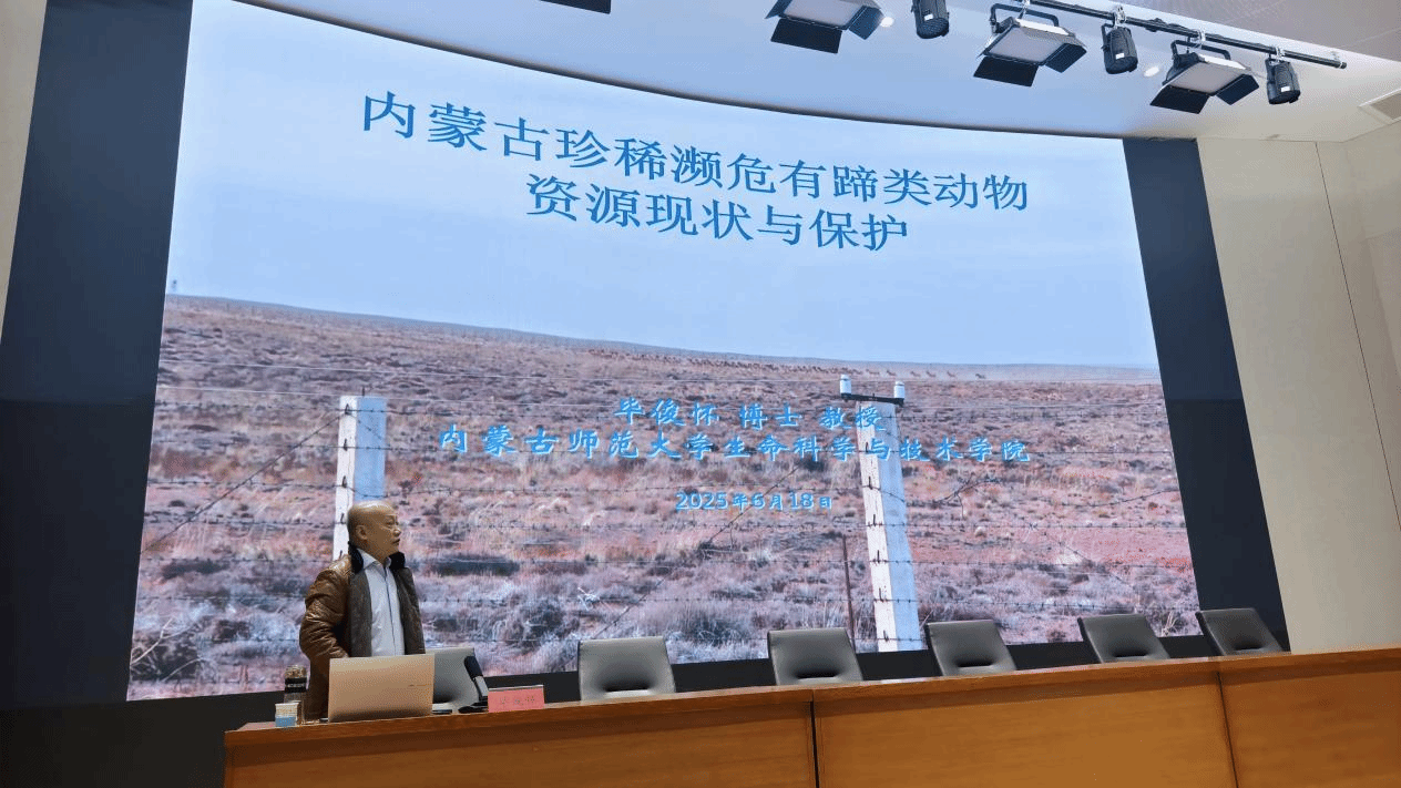 毕俊怀教授以立足北疆从事脊椎动物区系、分类、生态及保护管理教学和科研工作三十多年的实践经验,讲述了蒙古野驴、盘羊等内蒙古珍稀有蹄类动物的生态价值与保护现状。通过野外监测数据和影像资料,展示了内蒙古草原生态系统的独特性与脆弱性,重点指出:“生物多样性保护既是科学命题,更是关乎国家生态安全战略的重大课题。”